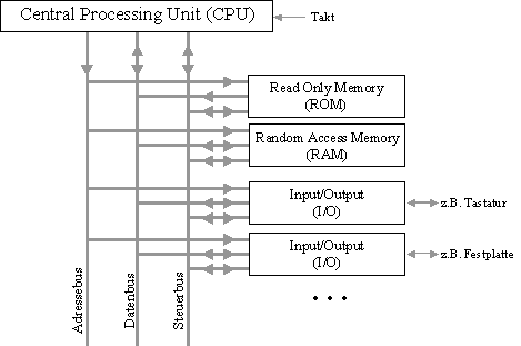 Die Central Processing Unit (CPU) ist das Herzstück eines jeden Computers. In ihr findet die Verarbeitung aller Daten statt. Sei es eine Mausbewegung, eine Eingabe über die Tastatur, Änderungen auf dem Bildschirm: immer ist die CPU daran beteiligt. Damit die CPU mit der Außenwelt kommunizieren kann ist sie mit einem Datenbus, einem Adressbus und einem Steuerbus versehen. Hinter einem Bus verbergen sich eine Anzahl von elektrischen Leitungen, die jeweils nur zwei Zustände einnehmen können. Die Breite der Busse (Anzahl der el. Kontakte) variiert. Typische Breiten für Adress- und Datenbus sind 32 Leitungen. Der Steuerbus umfasst ca. 10 Anschlüsse.