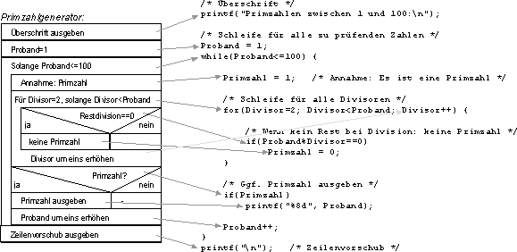 Als Beispiel soll ein einfacher Primzahlengenerator dienen, der die Primzahlen bis 100 ermittelt. Der vollständige Quellcode (mit kleinen unterschieden) ist im Abschnitt A1.1 wiedergegeben.