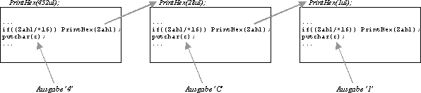 Die übergebene Zahl wird von der kleinsten (rechten) Stelle her Umgewandelt, wird aber dennoch in korrekter Reihenfolge, also von links nach rechts ausgegeben. Die Rekursion erfolgt beim zweiten if-Befehl, welcher die Zahl durch 16 dividiert, und bei einem Ergebnis ungleich 0 wieder die Funktion PrintHex aufruft.
