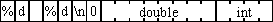 Der nächste Platzhalter steht wieder für den Typ int. Da aber der vorherige Platzhalter die Variable vom Typ double nur zur Hälfte eingelesen hat, versucht jetzt der zweite Platzhalter die zweite Hälfte der Variable d als int zu interpretieren. Es ist offensichtlich, das dabei Unsinn heraus kommt. In der Testumgebung sah das so aus: